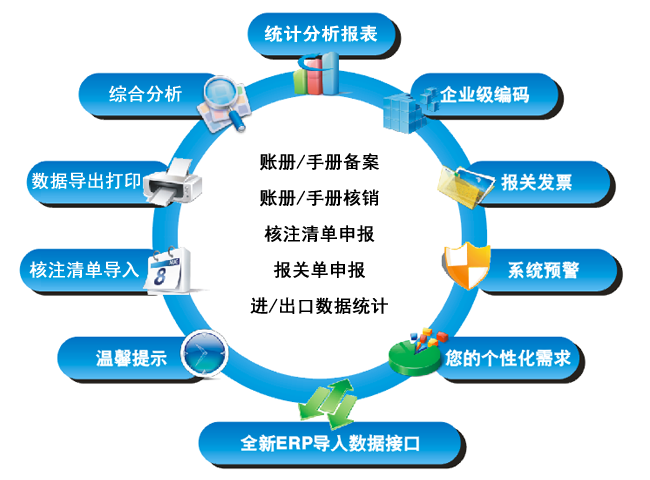 另外,系统还包含一系列分析和辅助功能,如:料件倒挂预警、商品编码变更提醒、通关参数查询、进/出口数据分析统计、一键提取核销数据等等;系统还提供相关通用导入接口,使企业能将数据进行快捷地导入,以便备案和通关。同时,系统所有功能模块基于一个平台开发,企业账册/手册备案、通关、管理等所有业务管理工作,都可以在一个操作平台内轻松实现。