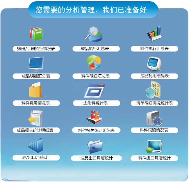 系统特别针对账册业务管理需求设计了若干统计分析管理报表,形成了独具特色的实用统计分析管理中心,也可针对企业需求,独立设计专门的统计报表。