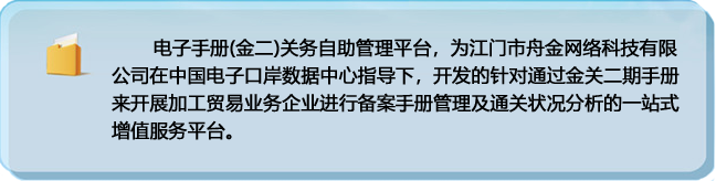 当前位置: 首页 -> 公司产品 -> 电子手册(金二)关务自助管理平台